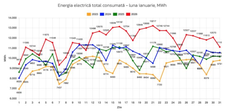 „Dacă ritmul se menține, luna februarie ar putea înregistra un nivel total superior anilor precedenți. Creșterea consumului și a vârfurilor de sarcină înseamnă o solicitare mai mare asupra infrastructurii de distribuție.”, a precizat companie.