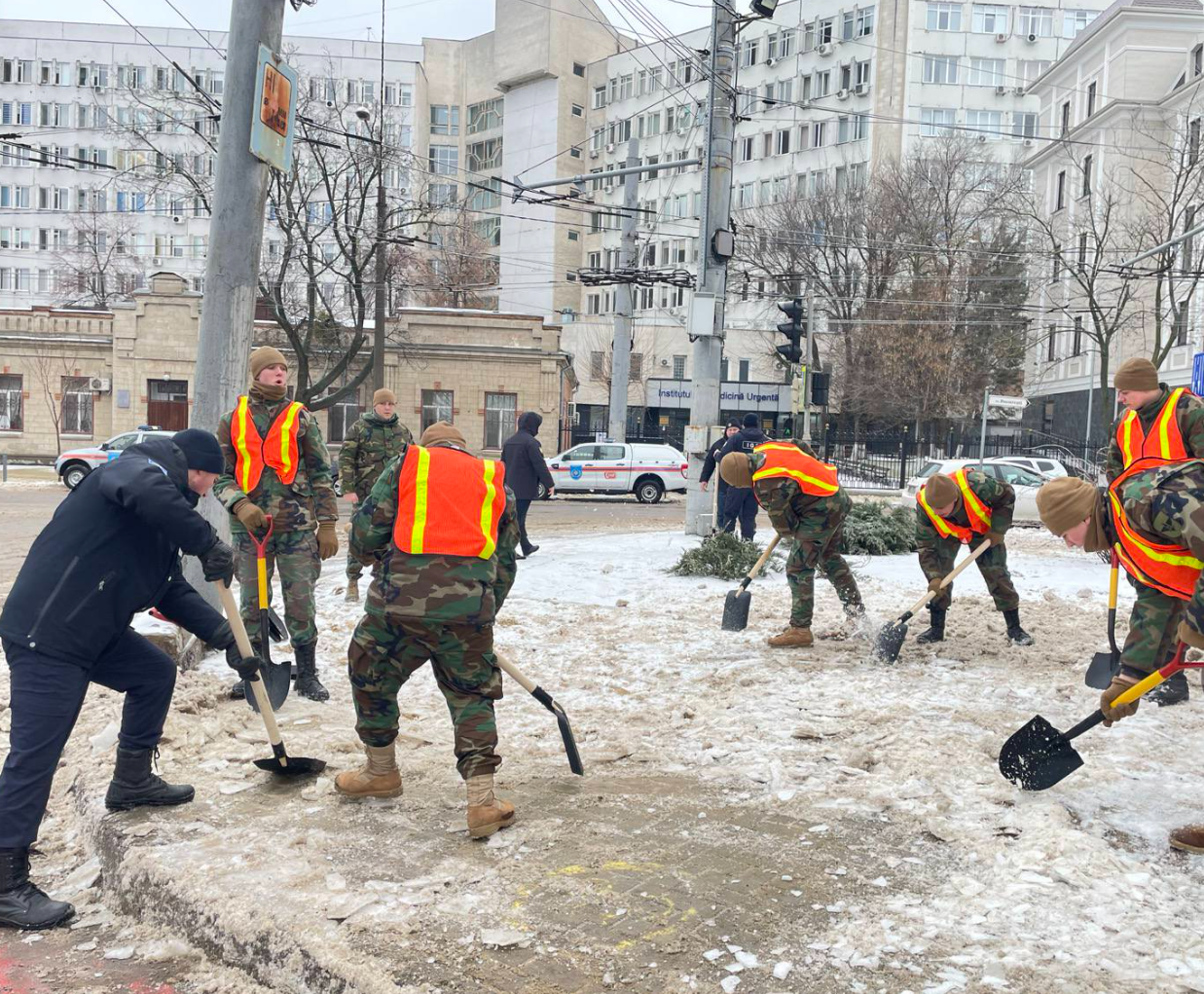 Totodată, mai multe echipe de intervenție din subordinea Ministerului Apărării, precum Batalionul 22 de Menținere a Păcii, Regimentul de Rachete Antiaeriene, Brigada de Infanterie Motorizată „Ștefan cel Mare”, Batalionul cu Destinație Specială „Fulger”, Academia Militară a Forțelor Armate „Alexandru cel Bun” și Regimentul de Stat Major „General de brigadă Nicolae Petrică”, împreună cu colegii de la Inspectoratul General pentru Situații de Urgență al MAI și Poliția Republicii Moldova, acționează în mai multe sectoare pentru curățarea trotuarelor și asigurarea accesului către instituții medicale și sociale, contribuind la siguranța cetățenilor.