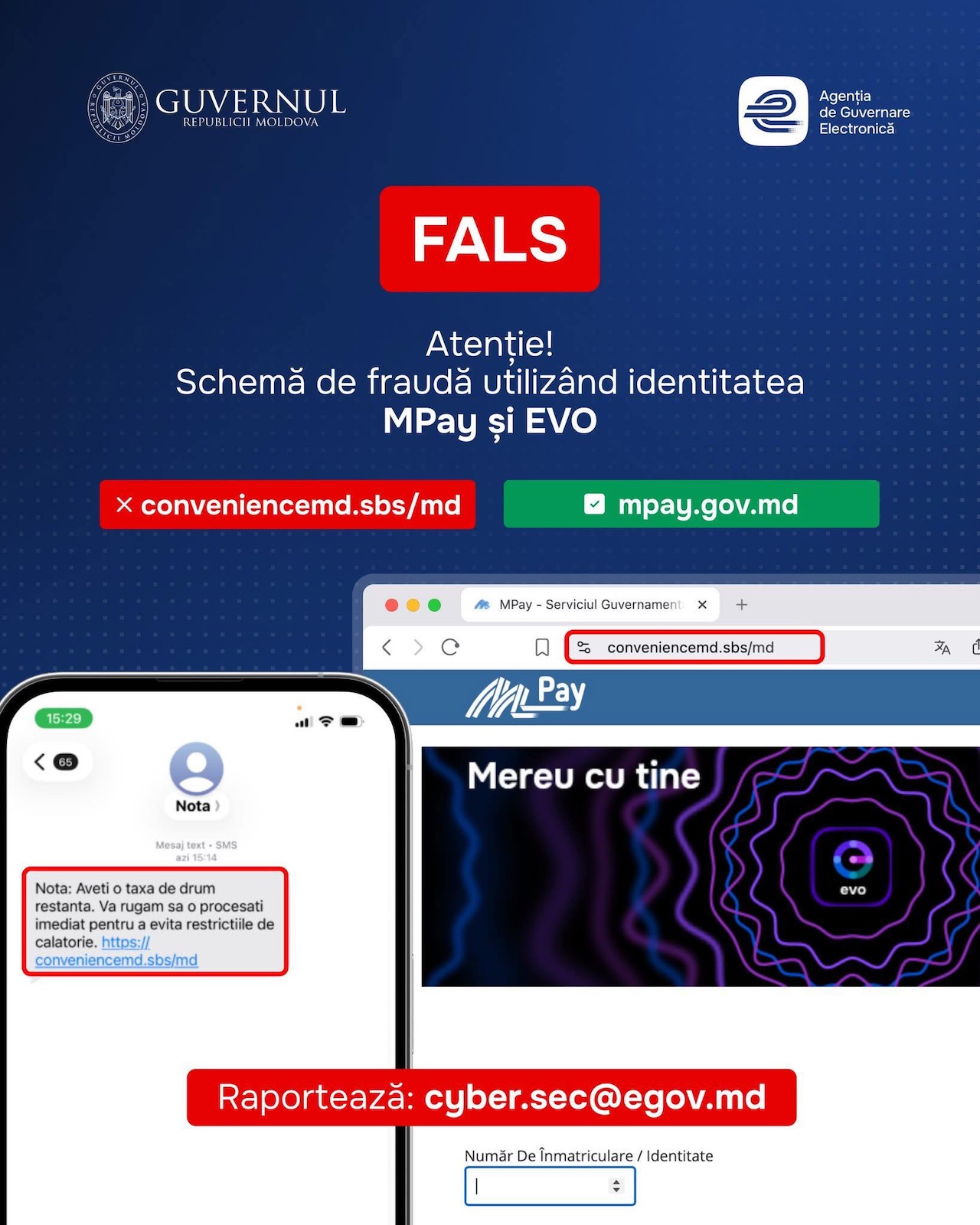 Agenția de Guvernare Electronică anunță despre identificarea unei scheme de fraudă care utilizează în mod ilegal identitatea MPay și EVO. În acest context, Guvernul recomandă cetățenilor să nu introducă date personale sau bancare pe site-uri necunoscute.