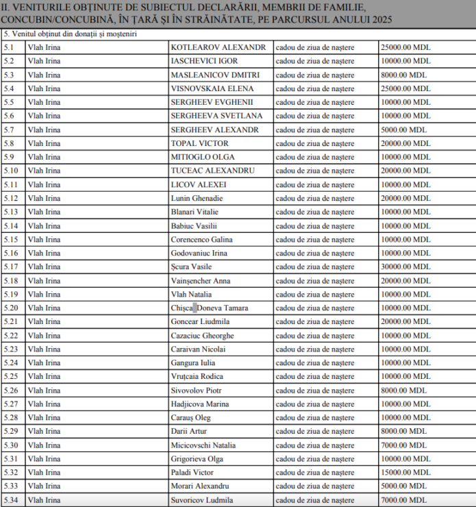 În 2025, cei mai mulți oameni i-au oferit Irinei Vlah, cu ocazia marcării vârstei de 51 de ani, câte 10 mii de lei. Totuși, alții au fost mai darnici, cu sume de până la 30 de mii, cum ar fi Vasile Șcura. Victor Topal, fostul șef al Direcției Serviciului de Informații și Securitate din Găgăuzia, în perioada când Irina Vlah era bașcană, i-a oferit acesteia 20 de mii de lei, la fel ca fiica ei, Anna Vainșencher. Natalia Vlah i-a dat fiicei sale 10 mii de lei. În 2024, Topal a oferit o sumă mai mică, de 10 mii de lei, în timp ce membrele familiei au lipsit din listă.