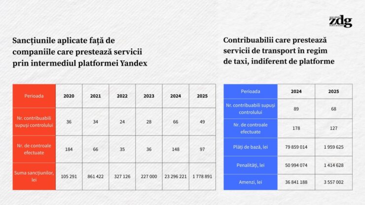 Datele generale prezentate de SFS, care a menționat că „nu sistematizează rezultatele controalelor pe tipuri de încălcări”, arată că în perioada 2020–2025, față de operatorii de transport rutier de persoane în regim de  taxi care prestează servicii prin intermediul platformei „Yandex” au fost aplicate sancțiuni în sumă de peste 26 de milioane de lei, cele mai mari sancțiuni fiind aplicate în 2024 – peste 23 de milioane de lei. În perioada 2024–2025, de către agenții economici au fost depuse 13 contestații, fiind emise nouă decizii privind respingerea contestației și menținerea deciziei contestate; două decizii privind satisfacerea parțială a contestației și modificarea deciziei contestate; o decizie privind suspendarea executării deciziei contestate și efectuarea unui control repetat, iar o contestație a rămas neexaminată „din motivul neînlăturării neajunsului”.