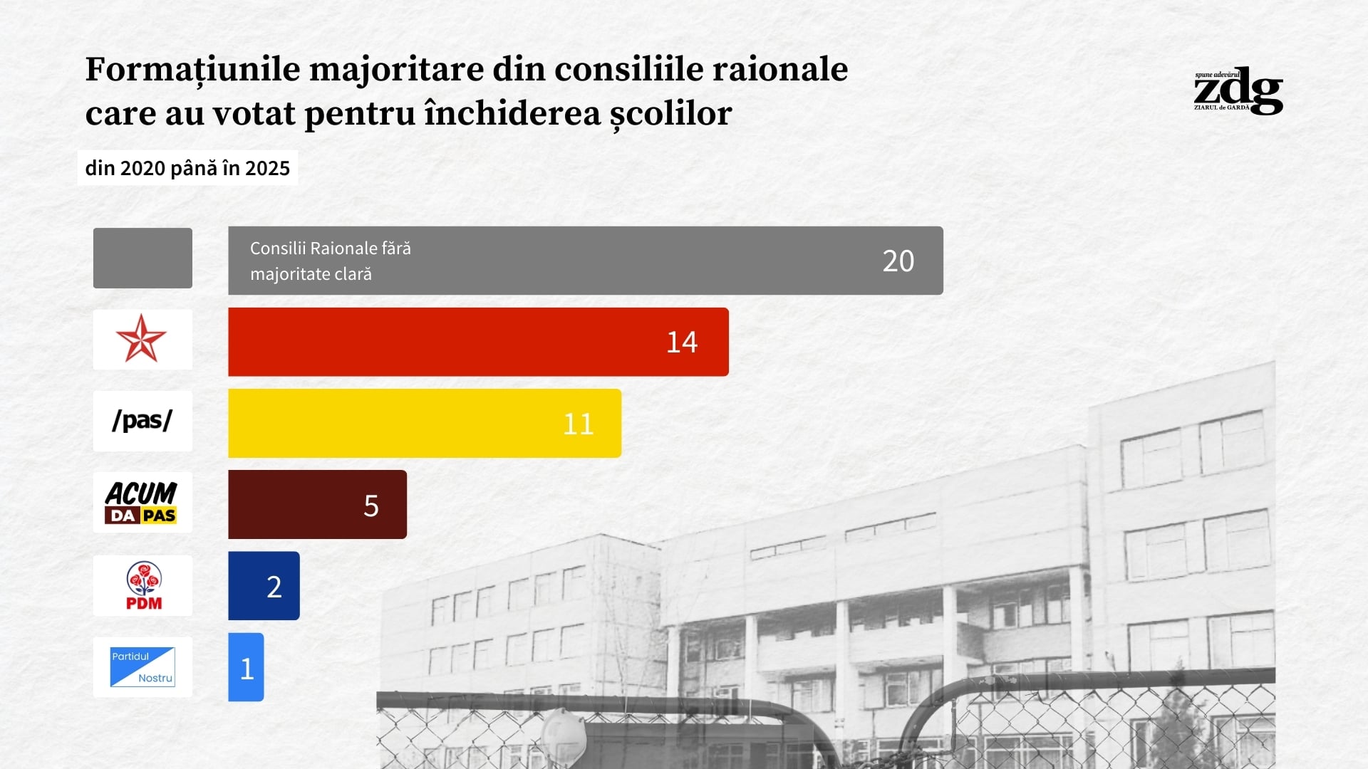 Datele analizate de ZdG arată însă contrariul. În realitate, PSRM, formațiune cu viziuni pro-ruse, domină lista consiliilor raionale care au votat pentru închiderea școlilor în ultimii cinci ani. În această perioadă, 14 consilii raionale cu majoritate PSRM au aprobat decizii de închidere, fiind urmate de cele controlate de PAS – 11 la număr. Blocul ACUM a fost responsabil pentru 5 astfel de decizii, PDM – pentru 2, iar Partidul Nostru – pentru o decizie. În restul cazurilor, închiderile au fost decise de consilii cu componențe mixte, fără o majoritate politică clară. Datele arată că închiderea școlilor este un fenomen mult mai larg, transpartinic, care se manifestă în raioane conduse de partide diferite, inclusiv de cele care promovează acum narațiunea că „guvernarea închide școlile”.