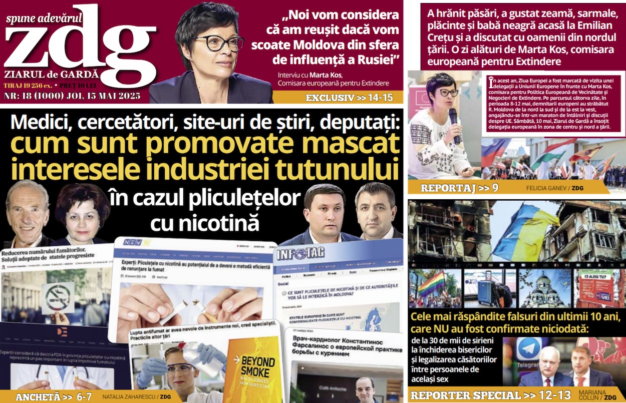 În cea de-a 18-a ediție tipărită a Ziarului de Gardă, aflați despre promovarea mascată a pliculețelor cu nicotină ca fiind o alternativă „mai puțin dăunătoare” de către unii medici locali, experți naționali și internaționali. Deși susțin că nu sunt plătiți pentru recomandările lor, ZdG a constatat că unii dintre aceștia au realizat studii finanțate de companii din industria tutunului. Materialul integral poate fi citit la rubrica Anchetă.