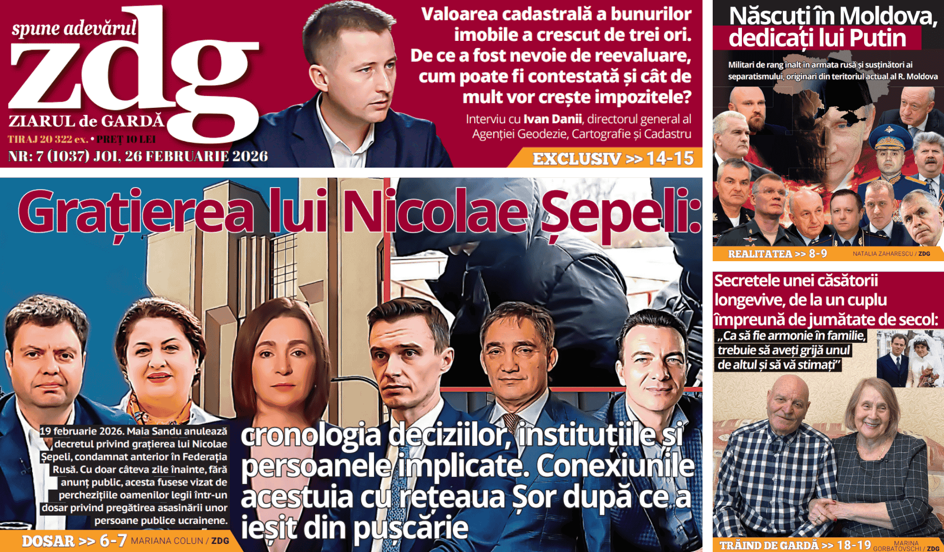 Într-o nouă ediție a ziarului tipărit, ZdG prezintă, la rubrica Dosar, cronologia deciziilor care îl vizează pe Nicolae Șepeli. Suspectat de organizarea tentativei de asasinat a unor persoane publice din Ucraina, Președinția a anunțat, pe 19 februarie 2026, revocarea decretului privind grațierea acestuia, acordată în 2022, după ce a fost condamnat anterior în Federația Rusă.