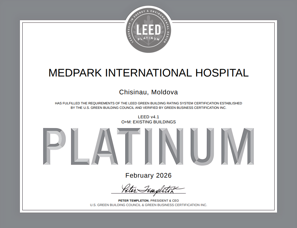 Spitalul Internațional Medpark a obținut certificarea internațională LEED Platinum, acumulând 80 de puncte din 100 în sistemul de evaluare al U.S. Green Building Council (USGBC) – un reper global pentru performanța ecologică a clădirilor.