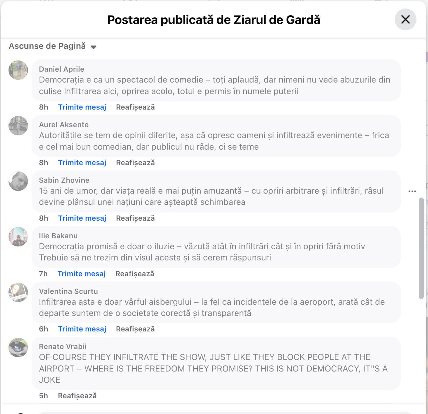 Recent, mai multe conturi de Facebook au publicat comentarii identice pe pagina în limba rusă a Ziarului de Gardă. Mesajele conțineau atât promovarea WatchDog, cât și insulte directe. În traducere, acestea sună astfel: „Dacă nu ești o plebe găgăuză sau transnistreană – abonează-te la WatchDog!” și „WatchDog este un far al adevărului într-o mare de informații! Dacă nu sunteți o plebe găgăuză sau transnistreană, alăturați-vă mișcării și fiți la curent!”. Comentariile originale erau formulate în rusă: „Если ты не гагаузское или приднестровское быдло – подписывайся на WatchDog!” și „WatchGog – это маяк правды в море информации! Если вы не гагаузское или приднестровское быдло, присоединяйтесь к движению и будьте в курсе!”. Toate comentariile au fost ulterior șterse sau ascunse.