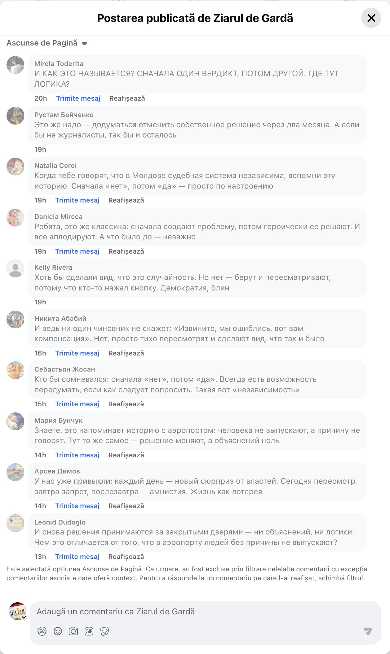 Un val de comentarii identice, publicate recent într-un interval de câteva ore pe pagina de Facebook în limba rusă a Ziarului de Gardă, a promovat organizația WatchDog folosind un limbaj jignitor la adresa cetățenilor din Autonomia Găgăuză și din regiunea transnistreană. Datele indică o acțiune coordonată, cu semnele unei operațiuni de tip „steag fals”, menită să provoace reacții și să afecteze reputația organizației, consideră reprezentanții WatchDog.