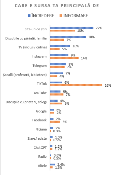 Studiul „Indexul YOUTH AIM 2025” arată că cei mai mulți tineri aleg să se informeze pe TikTok (26%), urmat de Instagram (14%), site-uri de știri (13%), Telegram (7%), discuțiile cu părinții, familia (7%), YouTube (7%), discuțiile cu prieteni, colegi (6%), Facebook (5%), TV (inclusiv online) (5%) și școala (profesorii, biblioteca) (4%).
