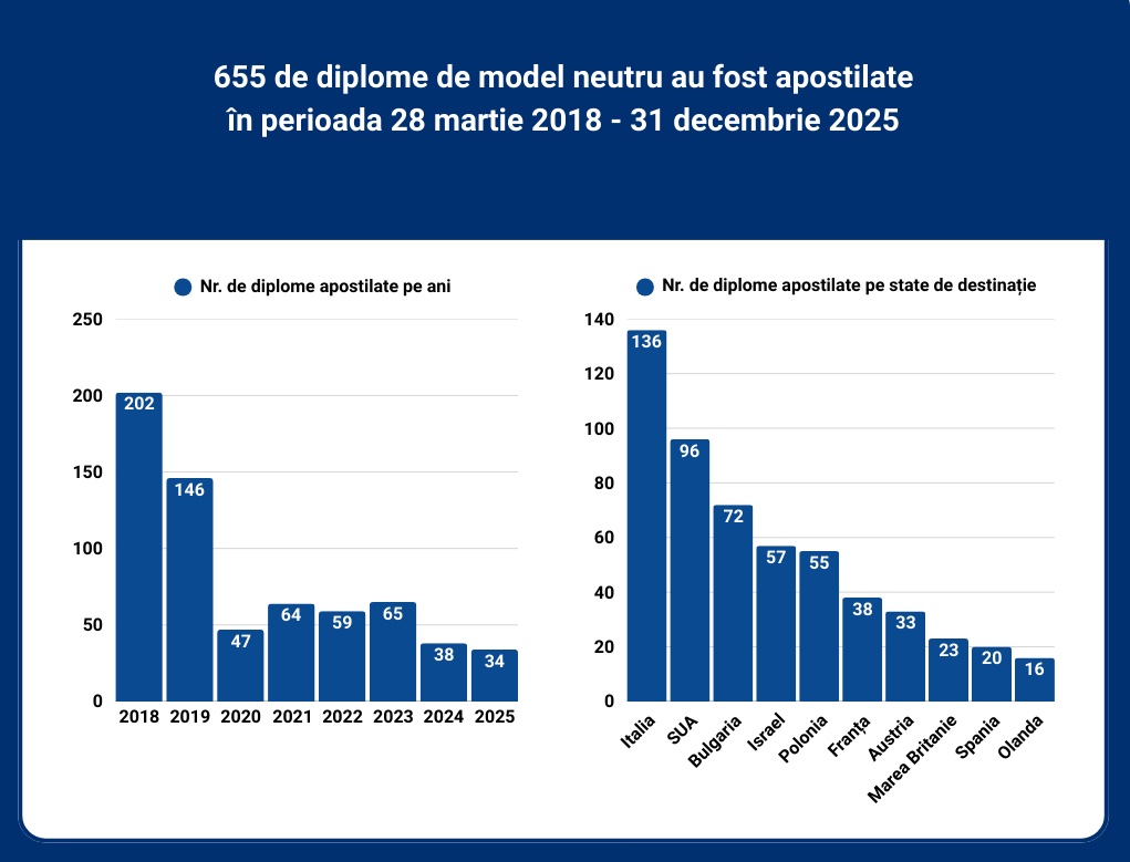 Pe parcursul a aproape 8 ani, 655 de diplome de model neutru ale căror posesori sunt tineri din regiunea transnistreană, au fost apostilate de către autoritățile R. Moldova, în conformitate cu prevederile legislației în vigoare și a celor agreate prin Decizia protocolare „Cu privire la aplicarea apostilei pe actele de studii din regiunea transnistreană” din 25 noiembrie 2017, anunță Biroul politici de reintegrare.