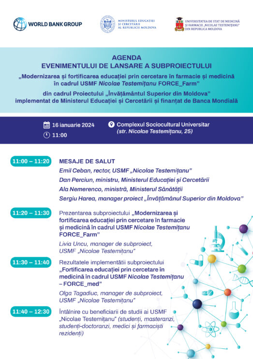 Universitatea de Stat de Medicină și Farmacie „Nicolae Testemițanu” din Republica Moldova Vă invită la evenimentul de lansare a subproiectului investițional „Modernizarea și fortificarea educației prin cercetare în farmacie și medicină în cadrul USMF Nicolae Testemițanu FORCE_Farm”, în valoare de 2 milioane de euro. Subproiectul dat se înscrie în runda a doua a apelului de subproiecte din cadrul Proiectului „Învățământul Superior din Moldova”, implementat de Ministerul Educației și Cercetării și finanțat de Banca Mondială.