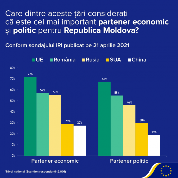 Uniunea Europeană este cel mai important partener politic și economic al Republicii Moldova, consideră majoritatea cetățenilor RM. Un sondaj realizat de IRI pe parcursul lunii martie arată că 72% dintre moldoveni văd UE drept principalul partener economic, iar 67% cred că UE este și principalul aliat politic al țării.