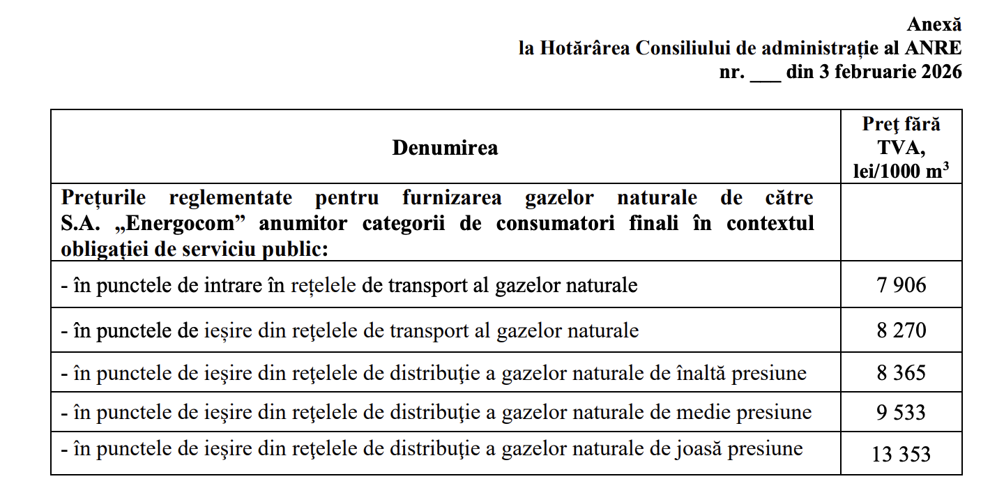 Tariful propus de ANRE este mai mic decât cel propus de SA „Energocom”, conform căruia consumatorii finali ar fi plătit 14.10 lei (fără TVA) pentru gazele naturale în 2026, adică cu 1.40 lei mai puțin decât tariful achitat în prezent.