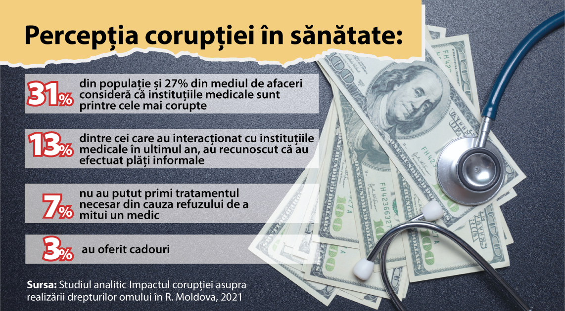 Potrivit studiului „Impactul corupției asupra realizării drepturilor omului în Republica Moldova”, prezentat în 2021, fiecare a șaptea persoană care a interacționat cu sistemul medical în ultimul an a recunoscut că a efectuat plăți informale sau a oferit cadouri pentru tratamentul primit (vezi infograficul). 7% din populație s-a confruntat cu situația în care fie ei, fie un membru al familiei nu au putut primi tratamentul necesar din cauza refuzului de a mitui un medic. Drept urmare, starea de sănătate a pacienților respectivi s-a deteriorat.