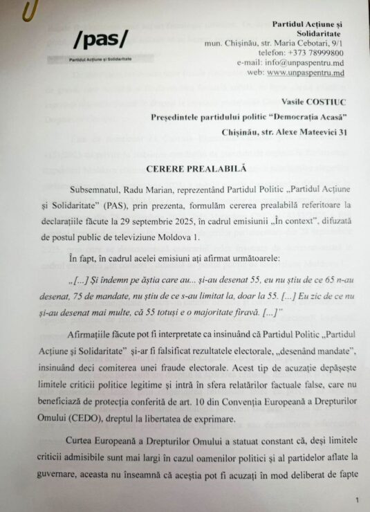 Deputatul Radu Marian, reprezentând Partidul Acțiune și Solidaritate (PAS) a depus o cerere prealabilă prin care îi cere lui Vasile Costiuc să dezmintă afirmațiiilr făcute la emisiunea „În Context” de la Molodva 1, „precum că PAS și-ar fi «desenat» și ar fi falsificat rezultatul alegerilor din 28 septembrie”.