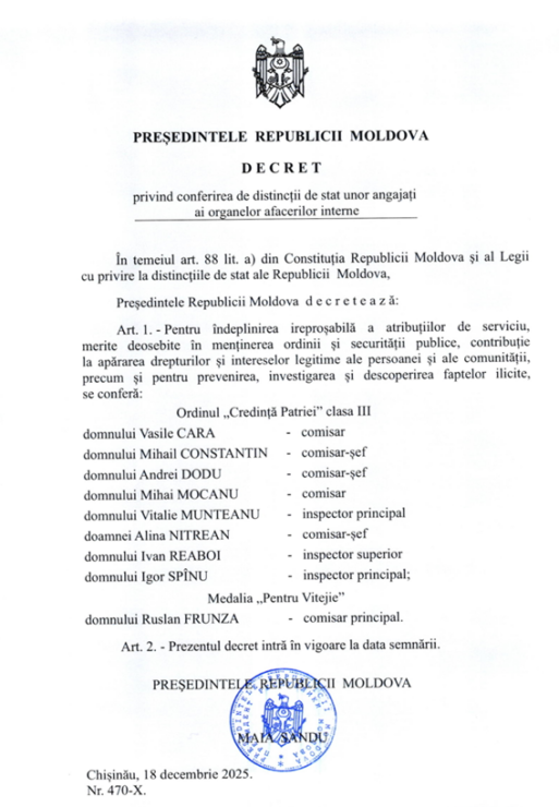 Cu prilejul Zilei Poliției Naționale, Maia Sandu a conferit distincții de stat