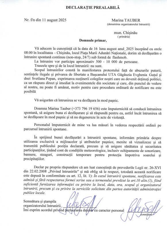 Pe 11 august, Marina Tauber, care a părăsit R. Moldova în ianuarie 2025, plecând spre Moscova, a trimis primarului orașului Chișinău, Ion Ceban, o declarație prealabilă privind organizarea unei „întâlniri spontane sub formă de flashmob” pe 16 august. Aceasta scrie că la „întâlnire” ar putea participa până la 10 mii de persoane. Se întâmplă în contextul în care, în ultimele zile, în spațiul online a circulat un video, în care penalul Ilan Șor îndeamnă cetățenii să iasă la protest, iar drept recompensă, promitea câte 3000 de dolari, lunar.