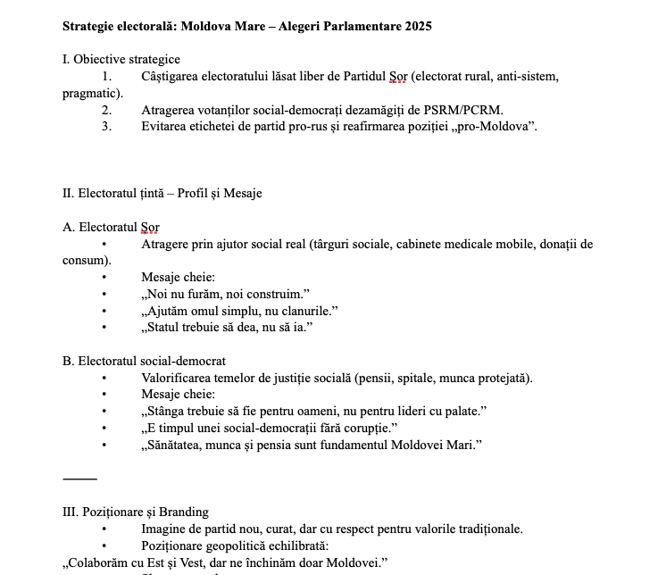 Unul dintre documentele scurse, intitulat VF, ar reprezenta programul de campanie și strategia electorală a partidului „Moldova Mare” pentru parlamentarele din 2025. Potrivit acestuia, formațiunea condusă de Furtună avea drept obiectiv câștigarea electoratului lăsat liber de fostul partid „Șor” (electorat rural, antisistem, pragmatic) și atragerea votanților social-democrați dezamăgiți de PSRM/PCRM.