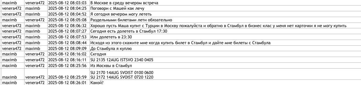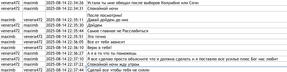 Potrivit discuției, curatorul ar fi anunțat-o pe Victoria Furtună că miercuri, 13 august 2025, ar urma să participe la o discuție și că joi, 14 august, trebuie să revină în țară. Aceasta ar fi urmat să zboare prin Istanbul.