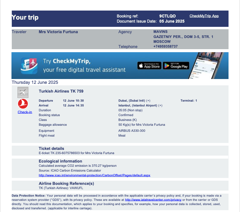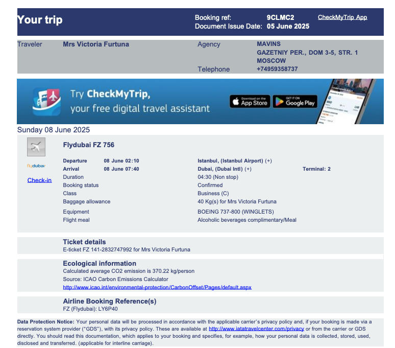 Potrivit datelor scurse, Furtună ar fi zburat în Federația Rusă și în Emiratele Arabe de mai multe ori, pe bani rusești. Corespondența dezvăluie cum aceasta ar fi cerut să i se procure bilete. Printre documentele scurse, am identificat bilete avia procurate prin intermediul unei agenții din Moscova.