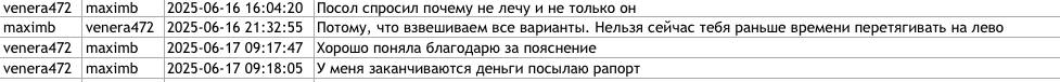 Câteva zile mai târziu însă, pe 16 iunie 2025, Furtună îi transmite un mesaj lui Anton în care-i comunică despre faptul că ambasadorul (F. Ruse în R. Moldova, n.r.) o întreabă de ce nu zboară și ea, făcând referire la Forumul Economic de la Sankt Petersburg, care urma să se desfășoare în câteva zile. Fosta procuroră adaugă că și alții au întrebat același lucru.