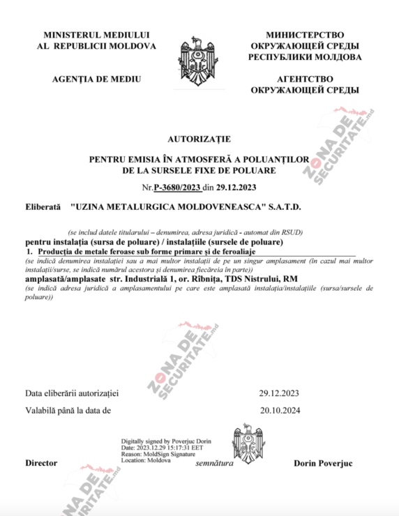Uzina metalurgică moldovenească din Râbnița (MMZ), gestionată de regimul separatist de la Tiraspol, a primit autorizații de mediu de la Agenția de Mediu a Republicii Moldova. Solicitarea autorizațiilor pentru „gestionarea deșeurilor și emisiilor de poluanți în atmosferă de la surse fixe” a venit din partea MMZ, relatează Zona de Securitate.