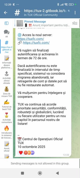 Cristina susține că a fost creat un grup pe aplicația Telegram pentru utilizatorii TUX, înainte ca platforma să fie închisă. Anterior, aceștia purtau discuții în acel grup, însă după închiderea platformei au început să primească doar anunțuri, necunoscând cine este administratorul canalului.