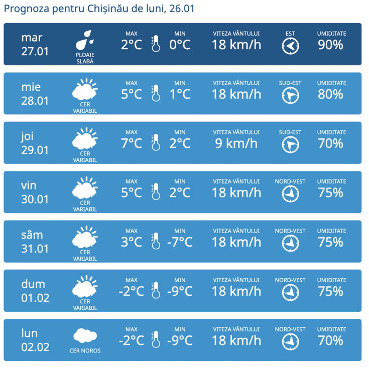 La Chișinău, miercuri sunt prognozate temperaturi maxime de până la 5 grade Celsius și minime de aproximativ un grad. În nordul țării se vor înregistra maxime de până la 5 grade Celsius și minime de până la -2 grade Celsius, iar în sud valorile termice vor ajunge la maxime de circa 7 grade Celsius și minime de până la 3 grade Celsius.