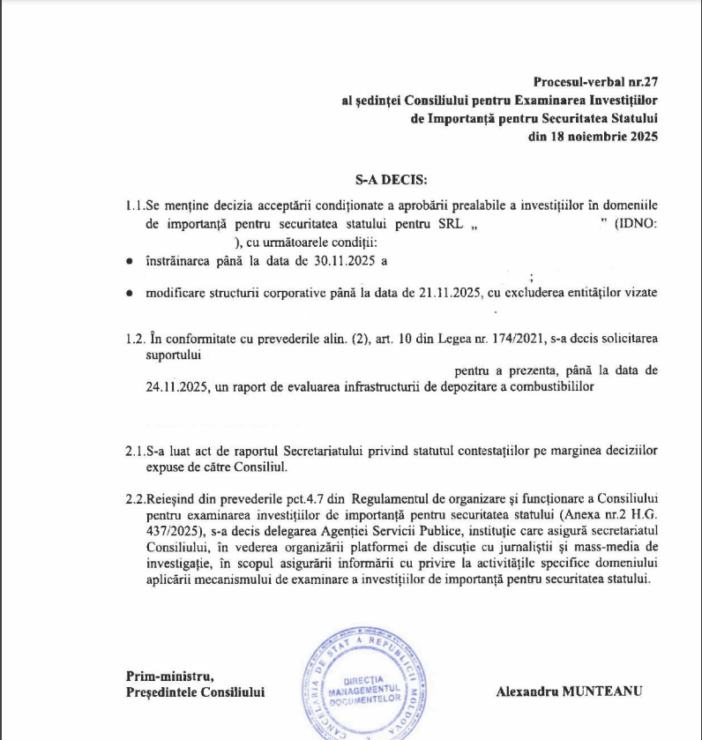 Extrasele proceselor verbale ale ultimelor trei ședințe ale Consiliul pentru Examinarea Investițiilor de Importanță pentru Securitatea Statului, prezidate de către prim-ministrul Alexandru Munteanu, sunt publicate pe site-ul Guvernului fără denumirile companiilor vizate.