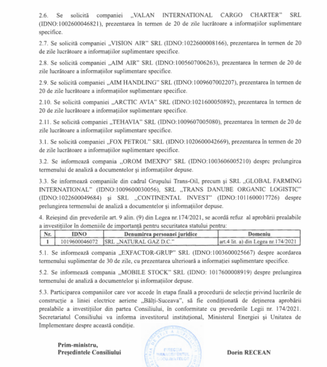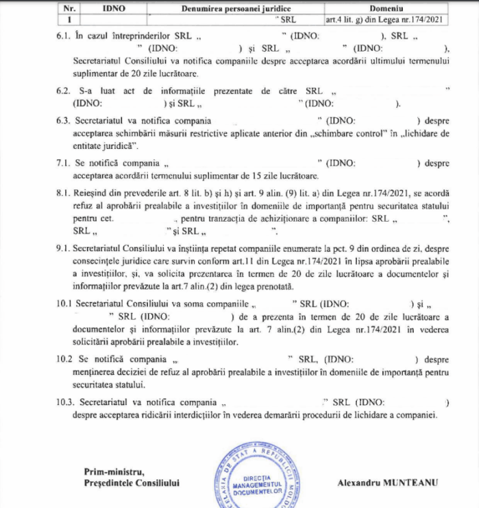 Pe de altă parte, extrasul procesului verbal de la ultima ședință a Consiliului prezidată de fostul prim-ministru Dorin Recean, la 13 octombrie 2025, conține denumirile companiilor vizate.