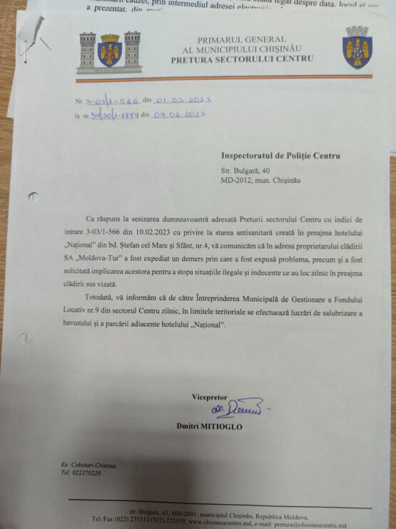 Una din sesizările Poliției transmise Primăriei municipiului Chișinău în iulie 2023, analizată de ZdG, a fost redirecționată de către instituție Preturii sectorului Centru, care la rândul său a transmis o cerere pe data de 26 iulie 2023, către Î.M. Servicii locative Centru cu următorul text: „Intervenim cu rugămintea să examinați posibilitatea executării lucrărilor de blocare a acceselor din interiorul construcțiilor Hotelului Național din toate direcțiile, pentru a nu admite accesul persoanelor fără loc permanent de trai”. În cazul altor două sesizări, din martie 2023, Pretura sectorului Centru a informat Poliția că, în adresa proprietarului clădirii, S.A. „Moldova-Tur” au fost expediate demersuri prin care a fost expusă problema, precum și s-a solicitat „implicarea pentru a stopa situațiile ilegale și indecente ce au loc în preajma clădirii”.