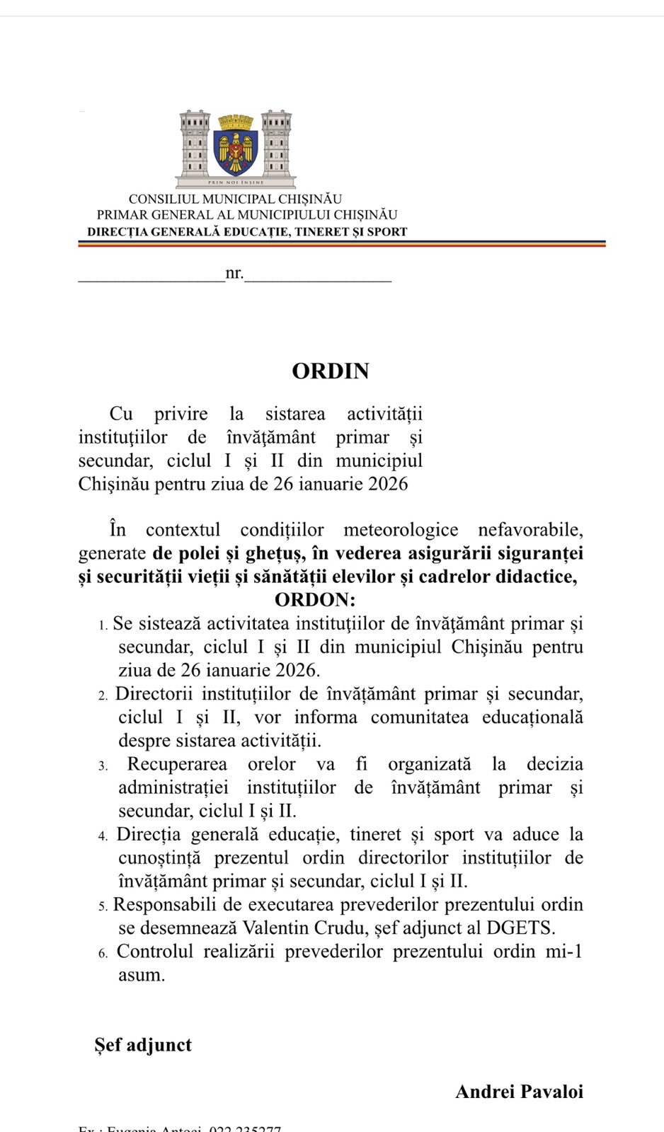 „Ministerul Educației și Cercetării recomandă instituțiilor de învățământ și organelor locale de specialitate în domeniul învățământului să evalueze situația specifică fiecărei școli și să decidă dacă pentru ziua de mâine, 26 ianuarie 2026, este nevoie de un regim special de desfășurare a lecțiilor – de exemplu online.