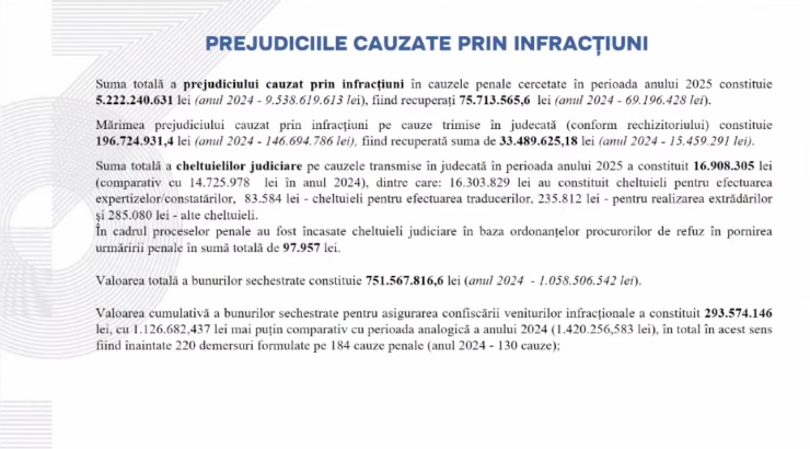 UPDATE 10:45 În anul 2025 procurorii au condus urmărirea penală în 39 250 cauze, mai mult cu 927 cauze, comparativ cu anul 2024 (38 323), 15.446 fiind soluționate, dintre care: