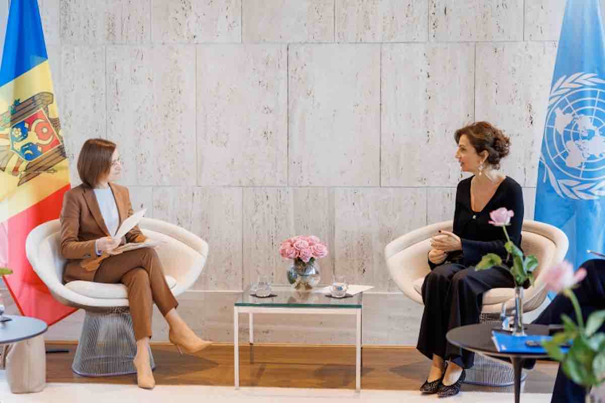 În cadrul vizitei de la Paris, Președinta Maia Sandu s-a întâlnit la sediul UNESCO cu directoarea generală, Audrey Azoulay. Acestea au discutat despre cooperarea în domeniile culturii, educației și protejării patrimoniului cultural al Moldovei. Un subiect important al discuției a fost protejarea limbii și culturii găgăuze, anunță Președinția printr-un comunicat de presă.