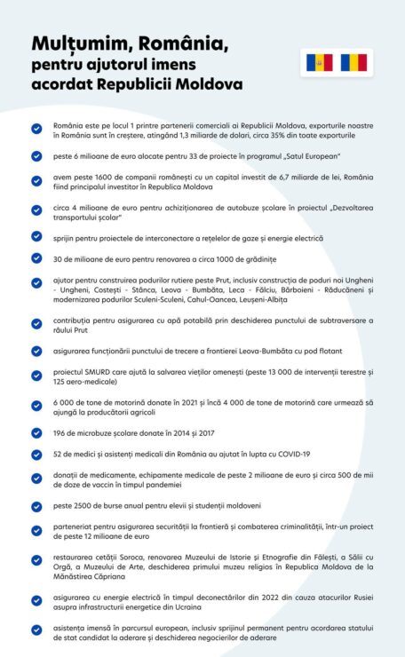 Președinta a publicat și o listă cu sprijinul oferit de România pentru Republica Moldova.