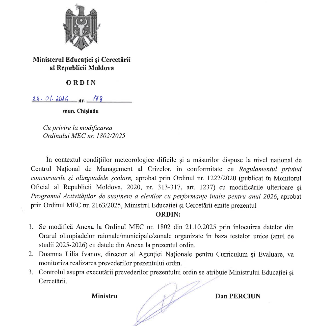 Ministerul Educației și Cercetării a aprobat modificarea Orarului de desfășurare a olimpiadelor raionale, municipale și regionale organizate în baza testelor unice, pentru anul de studii 2025-2026, în contextul măsurilor dispuse la nivel național de Centrul Național de Management al Crizelor.
