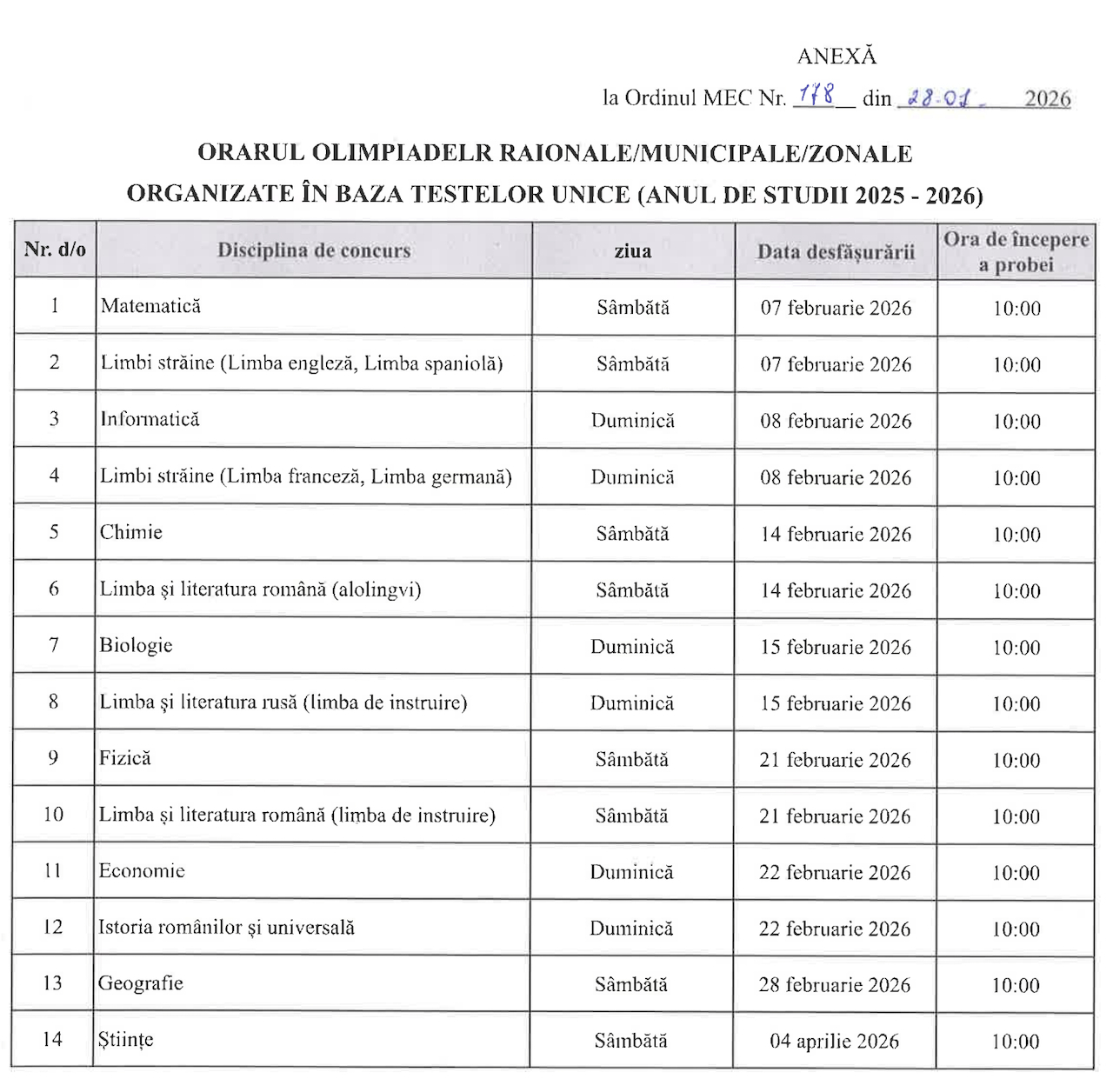 Astfel, olimpiadele vor începe sâmbătă, 7 februarie 2026, conform orarului stabilit prin Ordinul MEC din 28 ianuarie 2026.