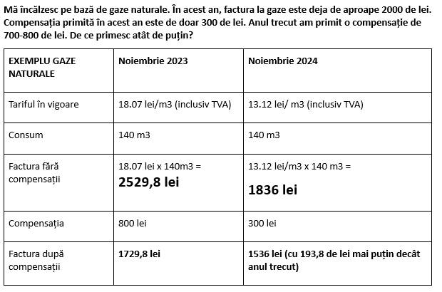 „Compensațiile din luna noiembrie, pentru consumatorii de gaze, au fost calculate pornind de la tariful din luna noiembrie – cel de 13.12 mdl pentru m3”.