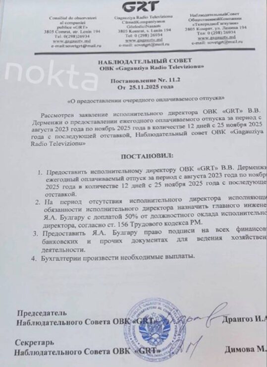 Consiliul de Supraveghere al companiei publice de radiodifuziune din Găgăuzia l-a trimis pe Vasili Dermenji în concediu cu demisie ulterioară, arată un document care a ajuns în posesia portalului nokta. Acest lucru se întâmplă după verificarea activității GRT și constatarea caracterului ei nesatisfăcător.