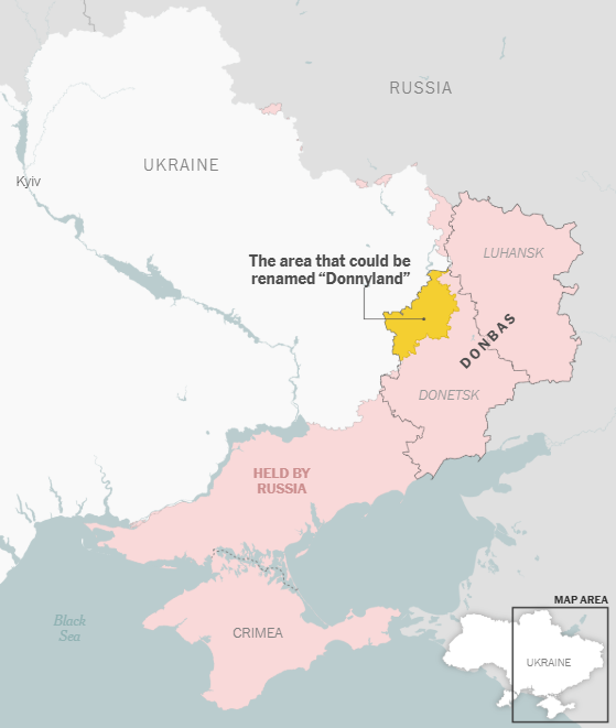 Cel mai improbabil exemplu în care numele președintelui Trump a fost împrumutat unui punct de criză geopolitică ar putea fi unul care a rămas ascuns publicului până acum. În discuțiile de pace din Ucraina din ultimele luni, oficialii ucraineni au sugerat că o parte din regiunea Donbas a țării pentru care Rusia încă luptă ar putea fi numită „Donnyland”.
