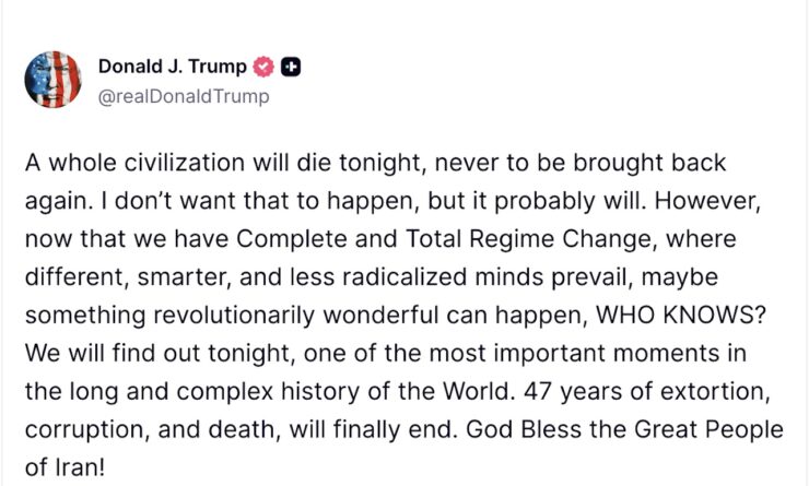 „O întreagă civilizație va muri în seara asta, și nu va mai fi readusă niciodată la viață. Nu vreau să se întâmple asta, dar probabil că se va întâmpla”, a scris președintele SUA, Donald Trump.