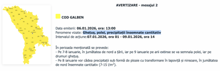 Conform avertizărilor meteo emise anterior de SHS, Din data de 5 ianuarie, ora 14:00, până pe 6 ianuarie, ora 10:00, în vigoare va fi codul galben de polei și gheață.