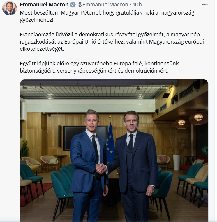 „Franța salută o victorie a participării democratice, a atașamentului poporului maghiar față de valorile Uniunii Europene și a Ungariei în Europa”, a declarat, de asemenea, pe X Emmanuel Macron, care a purtat o discuție cu Péter Magyar.