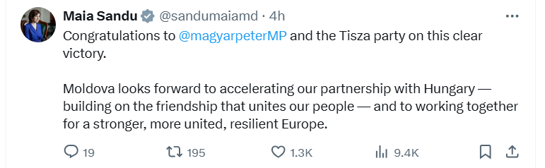 UPDATE 10:03 „Moldova așteaptă cu nerăbdare să accelereze parteneriatul cu Ungaria — construind pe prietenia care ne unește popoarele — și să lucrăm împreună pentru o Europă mai puternică, mai unită și mai rezilientă”, a transmis președinta Sandu pe X, după ce rezultatele preliminare ale alegerilor parlamentare din Ungaria desemnează partidului lui Peter Magyar câștigător, obținând mai mult de 50% din voturi.