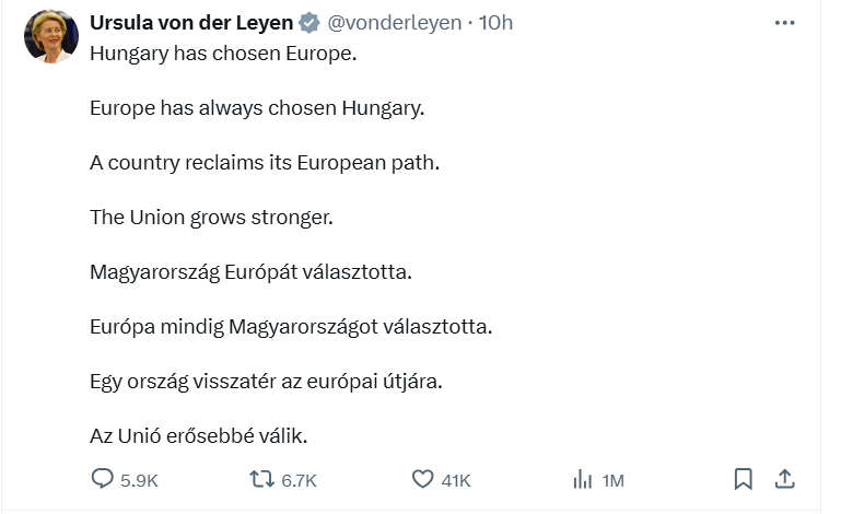 Cu mesaje de felicitare adresate lui Magyar au venit și mai mulți oficiali europeni.