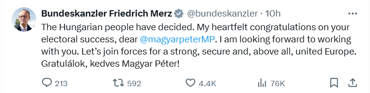 „Poporul ungar a decis. Felicitările mele sincere pentru succesul dumneavoastră electoral. Aștept cu interes să lucrăm împreună. Să ne unim forțele pentru o Europă puternică, sigură și, mai presus de toate, unită”, a transmis pe X și cancelarul german, Friedrich Merz.