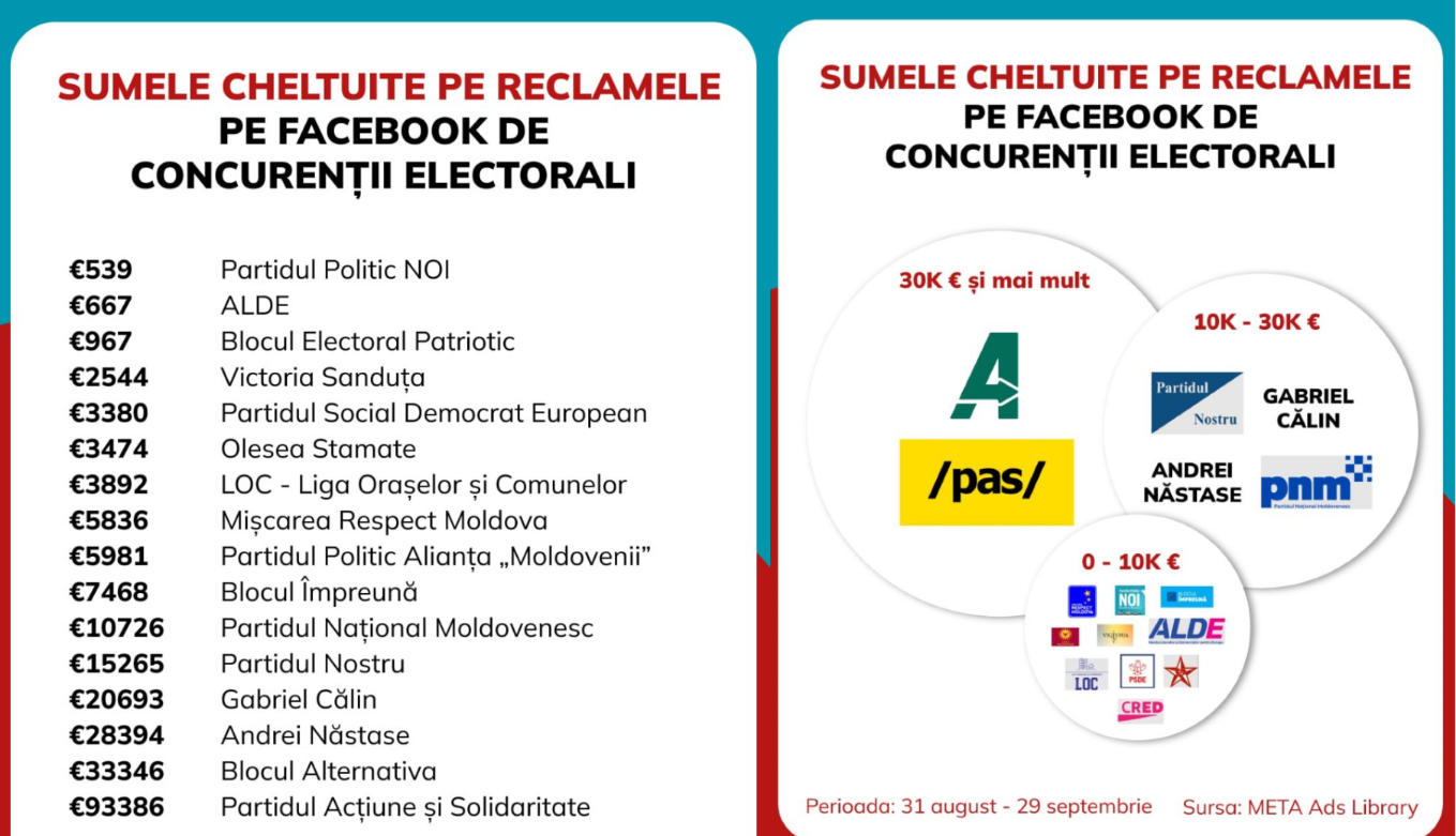 Potrivit analizei, în această campanie, Partidul Acțiune și Solidaritate (PAS) a cheltuit cel mai mult în promovarea formațiunii pe Facebook – 93 386 de euro pentru 826 reclame.