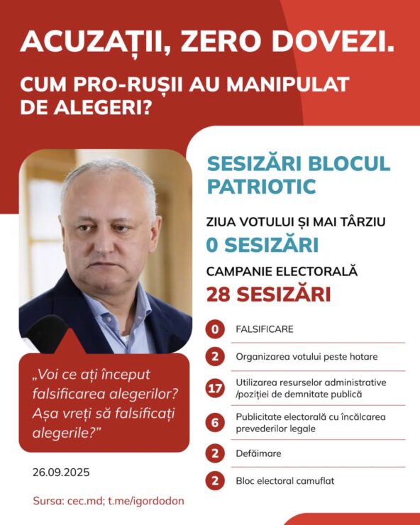 Totuși, în timpul campaniei electorale, formațiunea a expediat 28 de sesizări către Comisia Electorală Centrală (CEC), însă nici una nu s-a referit la falsificare. Șaptesprezece dintre acestea se referă la folosirea resurselor administrative și a pozițiilor de demnitate publică în scop electoral, șase la publicitate ilegală, două la defăimare și două la activitatea unui bloc electoral camuflat.