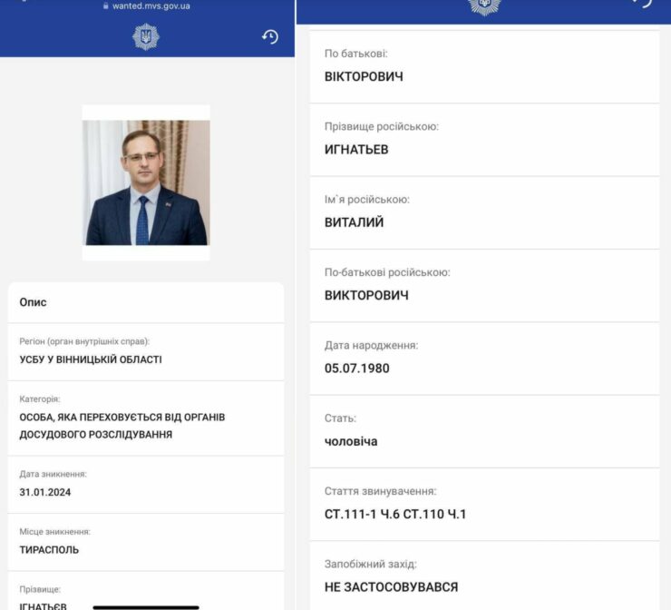 Așa-zisul ministru de externe din stânga Nistrului, Vitali Ignatiev, cetățean ucrainean, a fost dat în căutare de organele de drept din Ucraina, potrivit ziarnational.md. Acesta este suspectat de Serviciul de Securitate al Ucrainei (SBU) de „săvârșirea unor infracțiuni penale”, printre care efectuarea „îndemnurilor publice pentru schimbarea frontierelor teritoriului” și „desfășurarea de activități de informare în cooperare cu statul agresor (Rusia, n.red.)”.