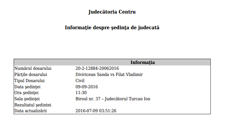 Prima şedinţă în acest litigiu a fost stabilită pentru data de 9 septembrie 2016. Potrivit sursei citate, cererea a fost înregistrată cu câteva zile înainte de verdictul Judecătoriei Buiucani din 27 iunie 2016, prin care Vlad Filat a fost condamnat la 9 ani închisoare pentru corupere pasivă şi trafic de influenţă.