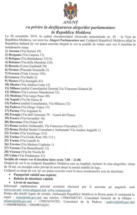 Pentru alegerile parlamentare noi, în cadrul circumscripției uninominale nr. 50 – la Veste de Republica Moldova, care vor avea loc duminică, 20 octombrie, pentru diaspora moldovenilor din Italia vor fi deschise 29 de secții de votare.